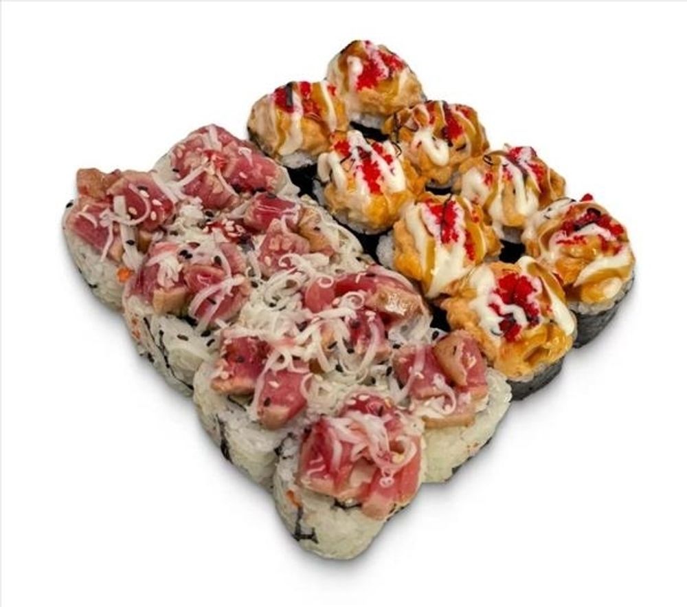 Эби бум (рис, нори, огурец, сыр сливочный, креветки спайси юдзу-май, масаго красная, унаги соус). (8 шт.) Тунец нисуаз (рис, нори, перец, сыр сливочный, тунец, моцарелла, брусничный соус, кунжут). (8 шт.)