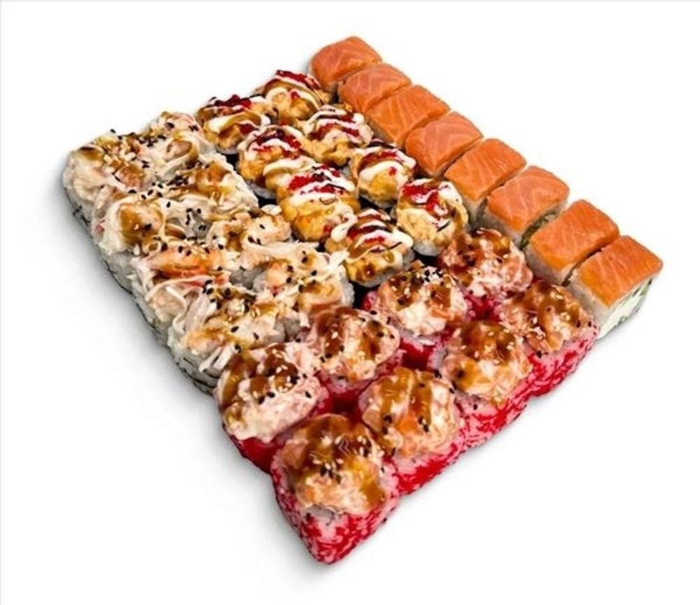 Сяке юдзу (рис, нори, снежный краб, сыр сливочный, масаго красная, лосось с/с, соус юдзу-май, унаги, кунжут). (8 шт.)