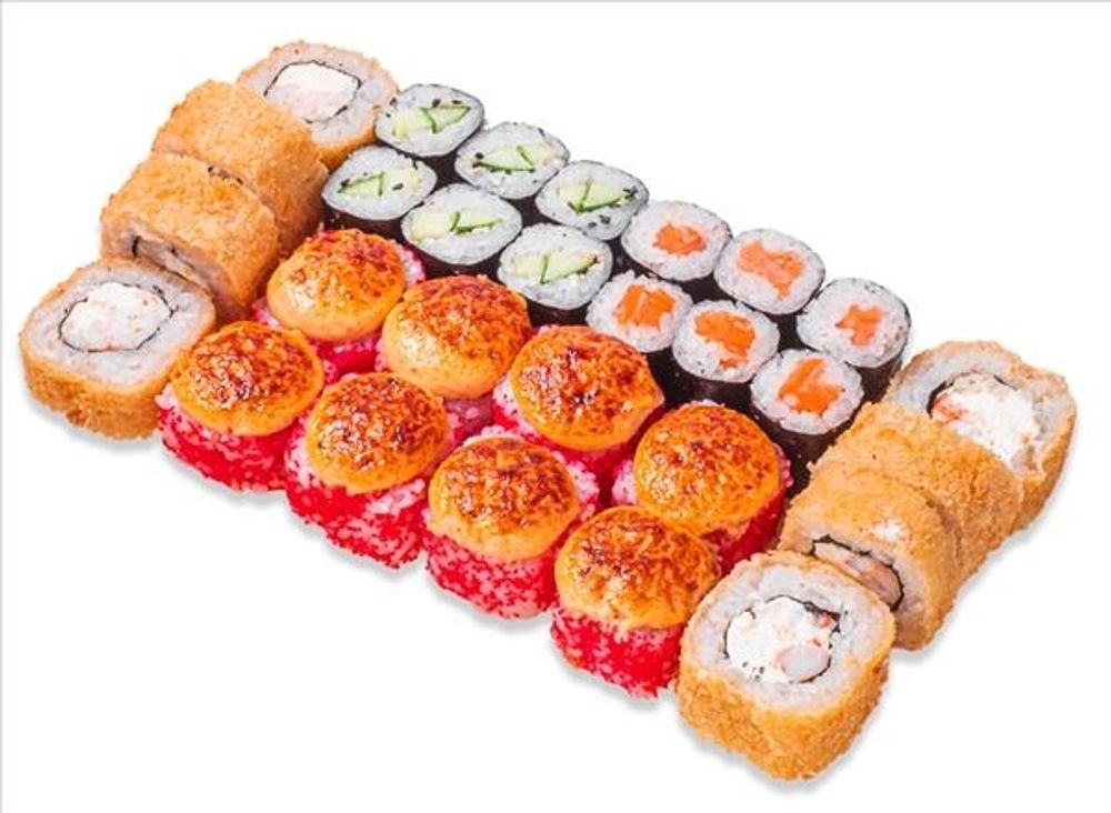 Гурмэ темпура (10 шт.). Окинава (8 шт.) Маки с огурцом (6 шт.). Маки с лососем (6 шт.) (28 шт.)