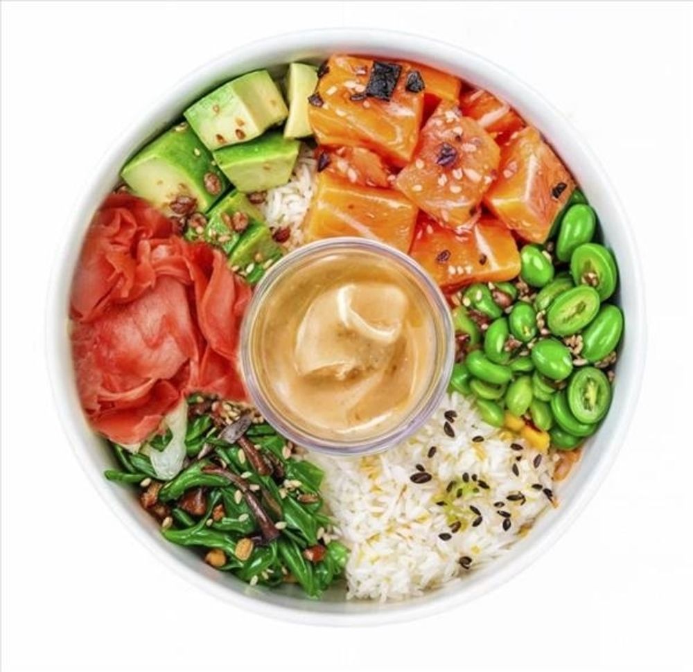 Рис, лосось, огурец, чука салат, эдамаме бобы, авокадо, нори, свит чили соус, масаго икра, лук криспи, имбирь, унаги соус.