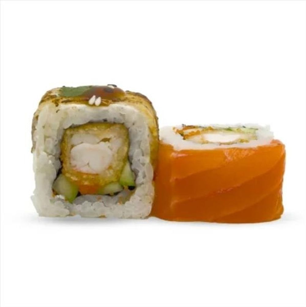 Рис, креветка в кляре, угорь, лосось слабосоленый, соус унаги, кунжут, сезонная зелень (8 шт.)