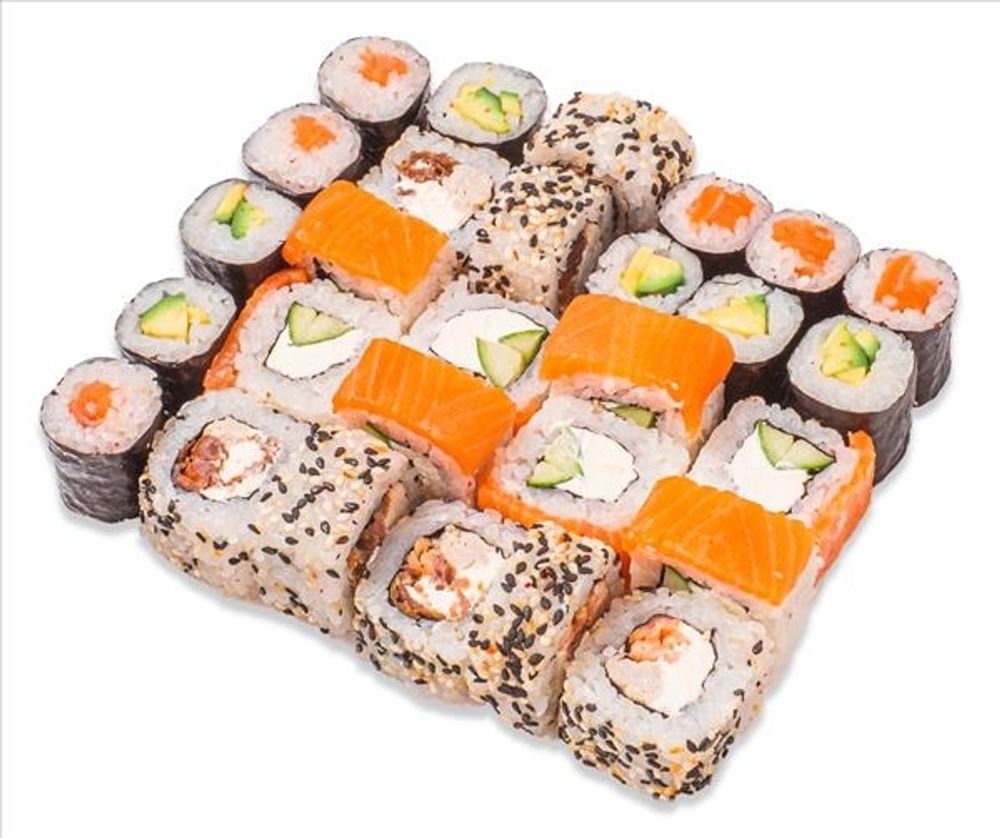 Филадельфия классик (8 шт.). Урамаки с жареным лососем (8 шт.).Мак с авокадо (6 шт.). Мак с лососем (6 шт.) (28 шт.)