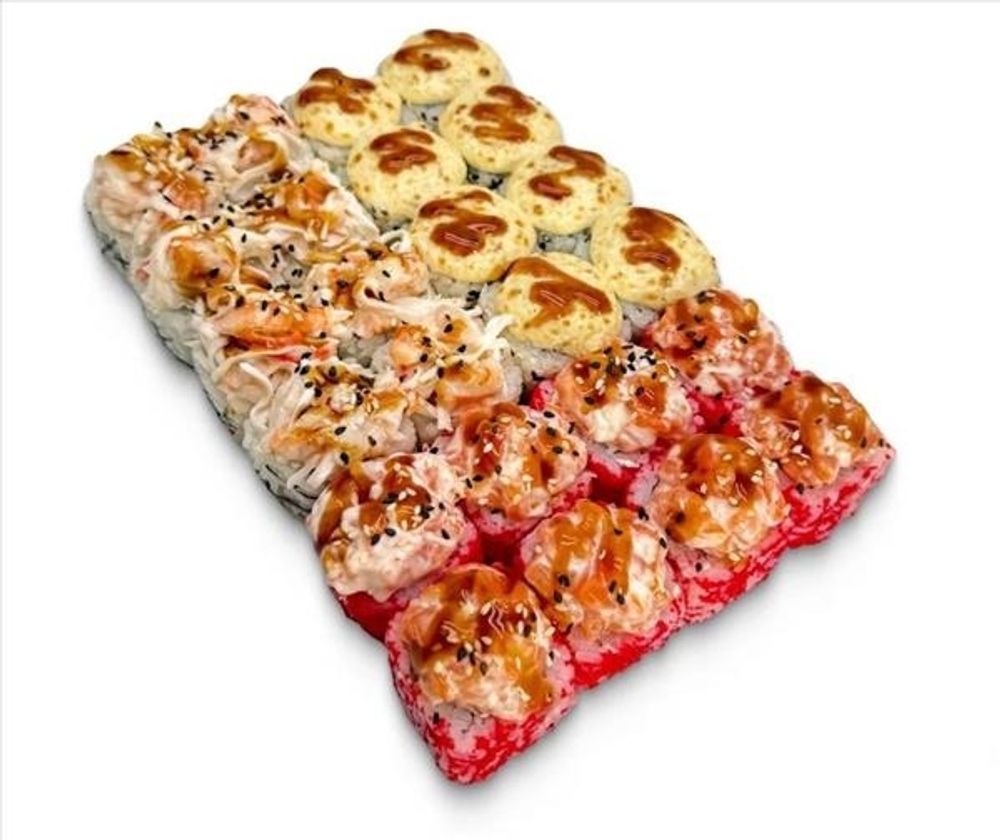 Сяке юдзу (рис, нори, снежный краб, сыр сливочный, масаго красная, лосось с/с, соус юдзу-май, унаги, кунжут). (8 шт.)