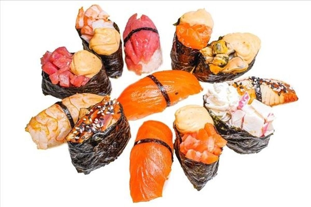 Сяке суши (1 шт.). Сяке холодного копчения суши (1 шт.). Эби суши (1 шт.). Унаги суши (1 шт.). Магуро суши (1 шт.). Гункан мидии спайси (1 шт.). Гункан снежный краб чиз (1 шт.). Гункан эби спайси (1 шт.). Гункан сяке спайси (1 шт.). Гункан сяке холодного копчения спайси (1 шт.). Гункан магуро спайси (1 шт.). Гункан унаги (1 шт.) (12 шт.)
