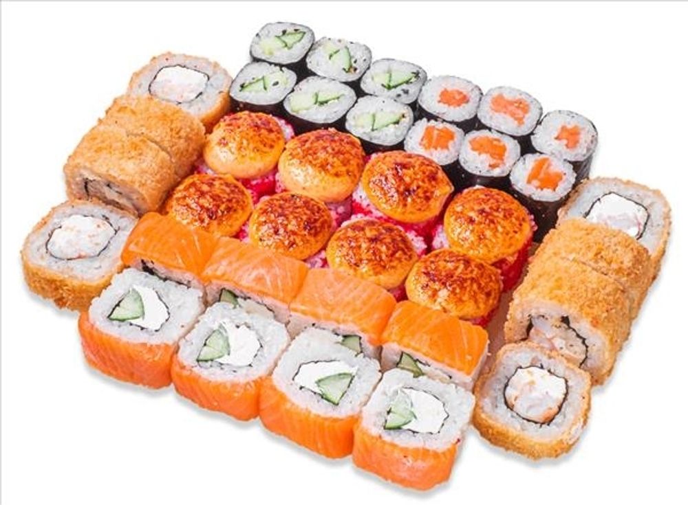 Филадельфия классик (8 шт.). Гурмэ темпура (10 шт.). Окинава (8 шт.). Маки с лососем (8 шт.). Маки с огурцом (8 шт.) (36 шт.)