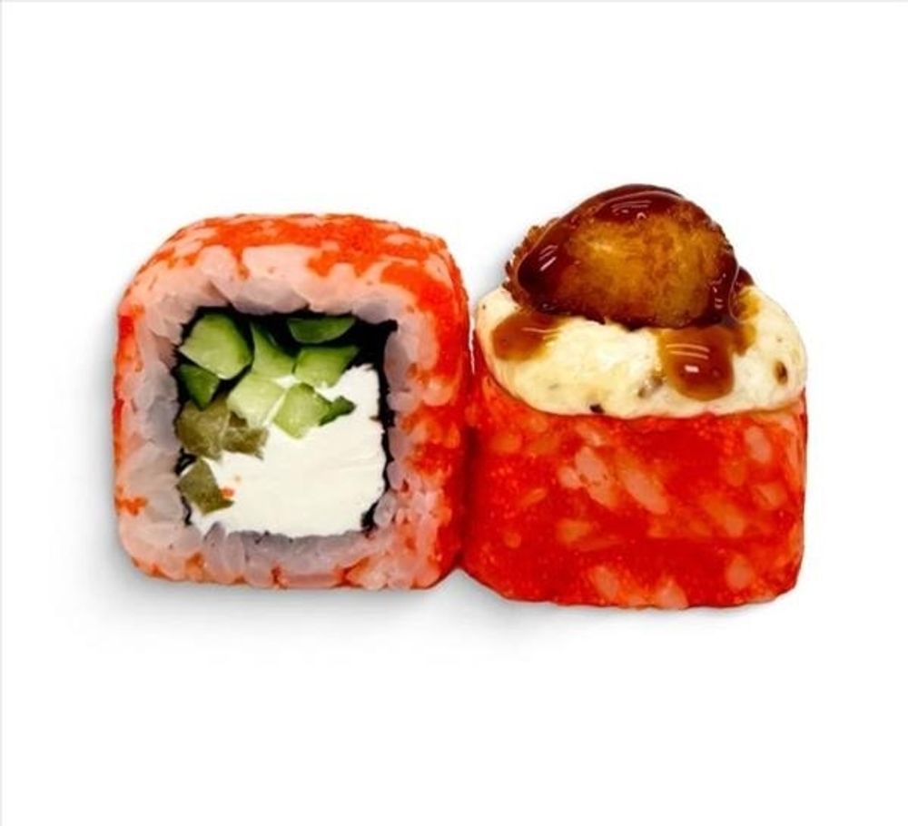 Рис, нори, перец, огурец, сыр сливочный, оранжевая масаго, сырно-ореховый соус, креветки в темпуре, унаги-соус. (8 шт.)