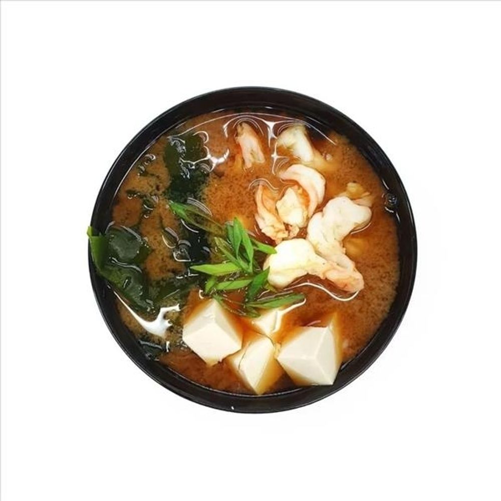 Бульон мисо, тофу, креветки, вакаме, кунжут.
