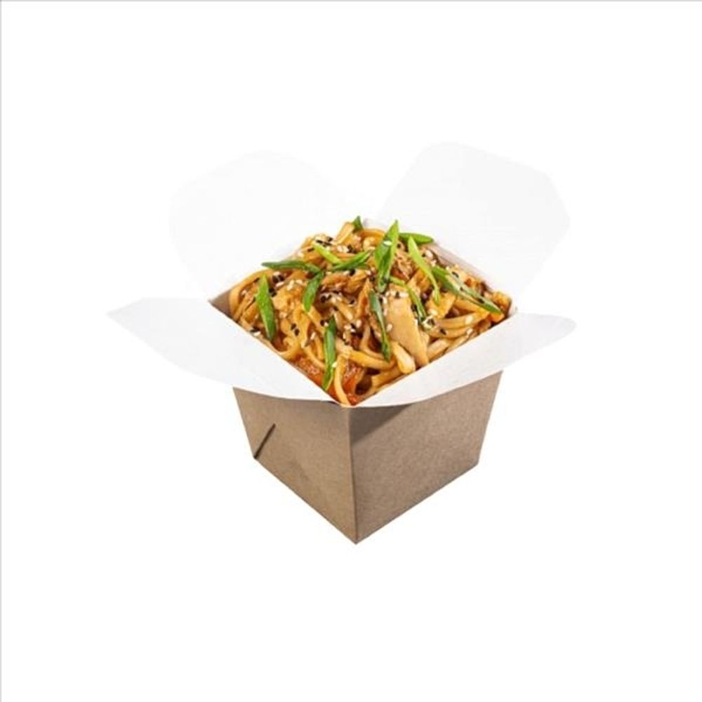 Удон лапша, морковь, перец болгарский, лук репчатый, курица, терияки-соус, кунжут белый.