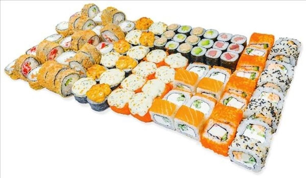 Запеченный лосось спайси (8 шт.). Темпура с креветкой (10 шт.). Темпура с лососем (10 шт.). Темпура с копченой курицей (10 шт.). Запеченная Калифорния (8 шт.). Верона (8 шт.). Филадельфия классик (8 шт.). Калифорния классик (8 шт.) Урамаки с жареным лососем (8 шт.). Мак с авокадо (6 шт.). Мак чука (6 шт.). Мак тунец (6 шт.) (96 шт.)