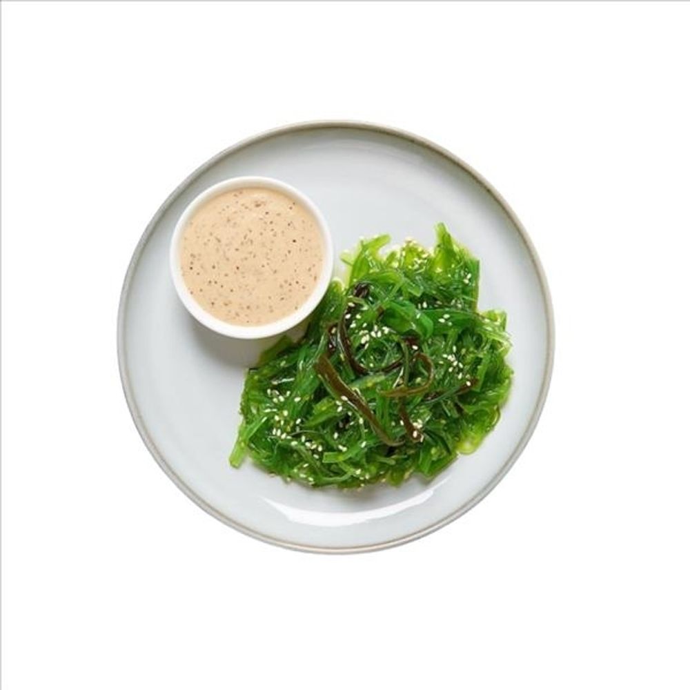 Салат чука с ореховым соусом и лимоном, посыпанный жареным кунжутом.