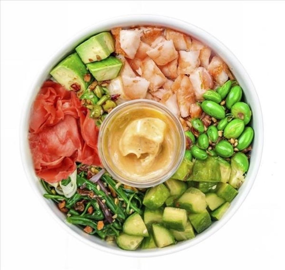 Рис, креветки, огурец, чука салат, эдамаме бобы, авокадо, нори, цитрусовый соус, масаго икра, имбирь.