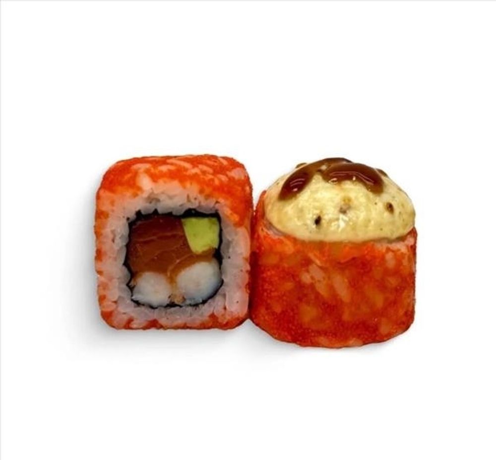 Рис, нори, лосось, креветка, авокадо, масаго оранжевая, сырно-ореховый соус, унаги-соус. (8шт.)