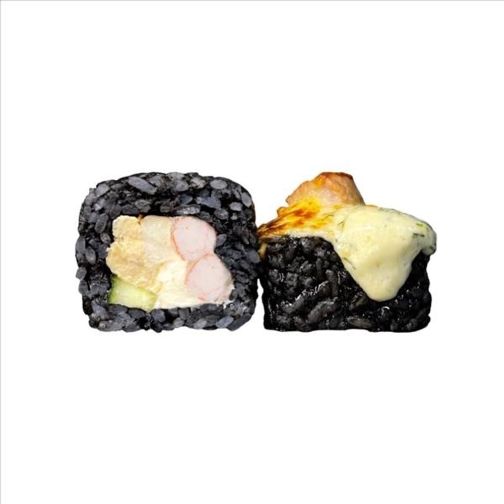 Рис, чернила каракатицы, креветка, тунец, творожный сыр, огурец, омлет томаго, спайси-соус, сырно-чесночный соус (8 шт.)