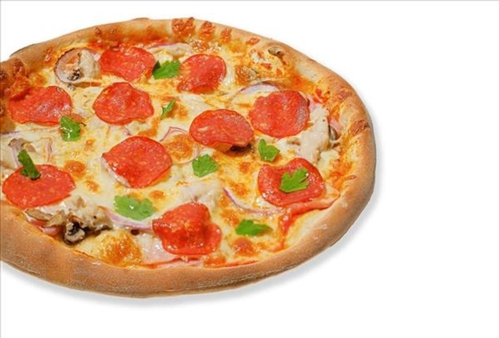 Томатный соус, острый спайси-соус, томаты, ветчина, пепперони, сыр моцарелла, курица, бекон, лук красный, шампиньоны.
