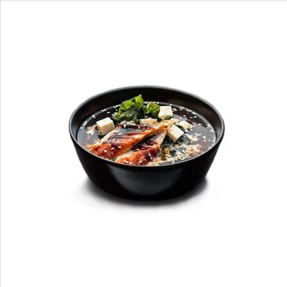 Бульон мисо, тофу, угорь, вакаме, кунжут.