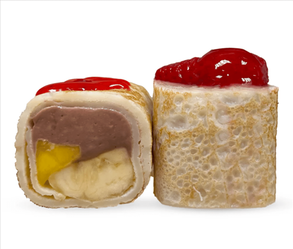 Блин, сливочный сыр, нутелла, манго, банан, клубника, фруктовый топпинг, кокосовая стружка. (6 шт.)