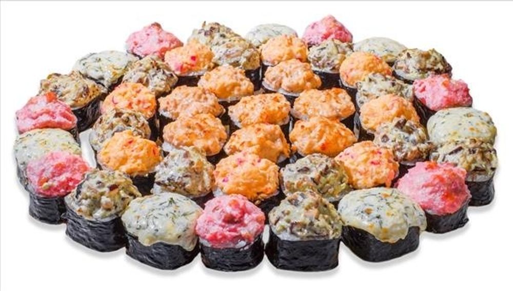 Запеченный краб (8 шт.). Чикен ролл (8 шт.). Верона (8 шт.). Запеченный острый лосось (8 шт.). Сливочный лосось (8 шт.). Запеченный с грибами шиитаке (8 шт.) (48 шт.)
