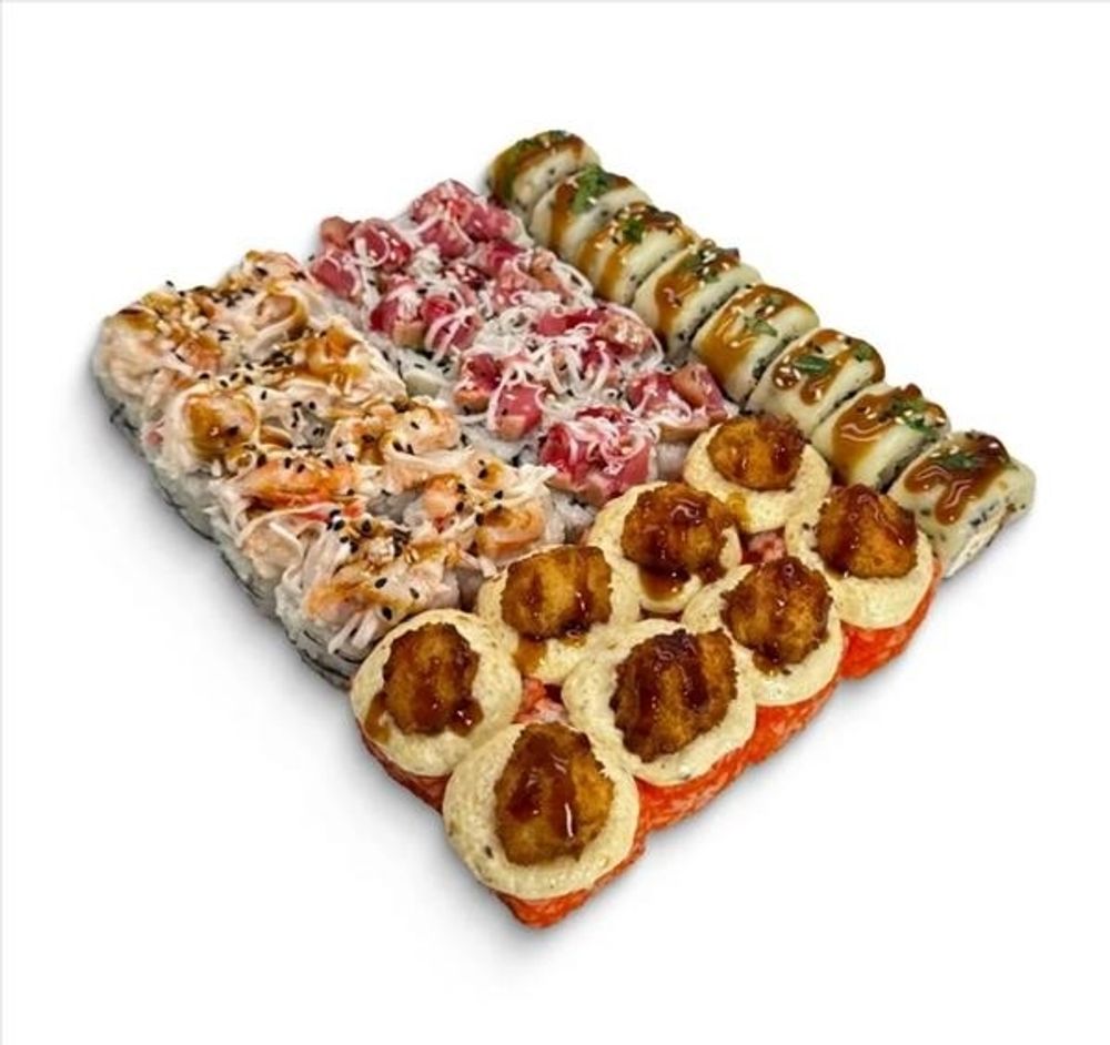 Монохром (рис, нори, огурец, сыр сливочный, краб снежный, креветки, юдзу-май, кунжут, унаги-соус). (8 шт.)
