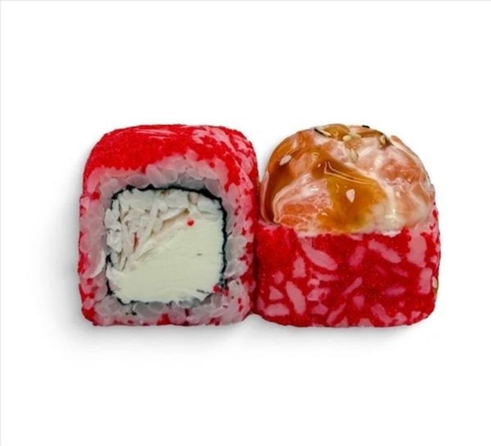 Рис, нори, снежный краб, сыр сливочный, масаго красная, лосось, соус юдзу-май, унаги, кунжут. (8 шт.)